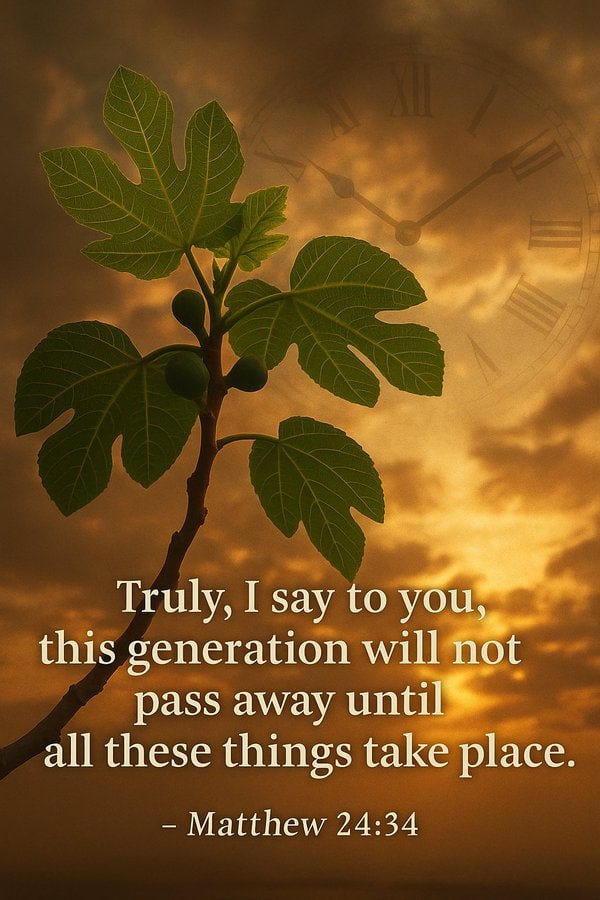 Jesus said: when you see the fig tree bloom and “all these things” begin, know the end is near — and that generation will not pass away until all is fulfilled (v.34).